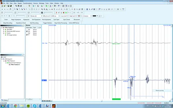 With the eego sports asa is shipped. asa is very powerful and advanced for EEG analysis and has some useful features for EMG analysis as well. First we apply some basic high pass filtering (3Hz - ∞) and notch filtering (50Hz).